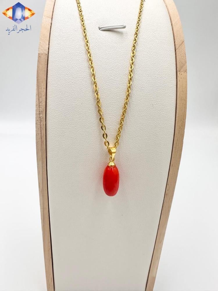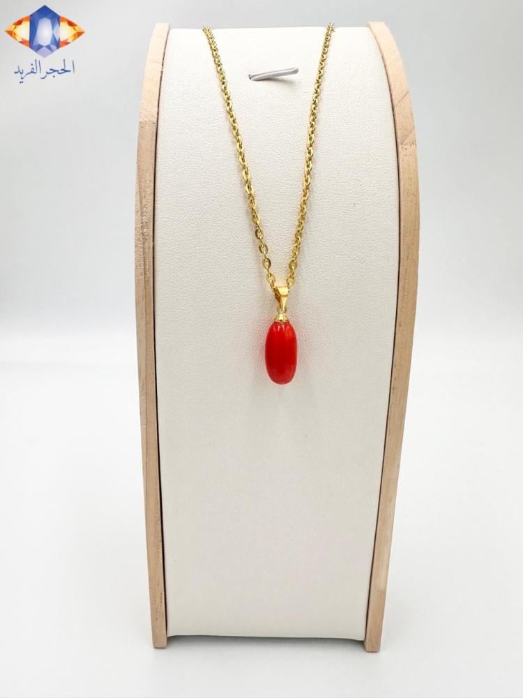* تعليقة من حجر المرجان الأحمر البرتقالي ( كورال ) الكريم الخام وسلسال ذهبي – رمز الأناقة والجمال الطبيعي *